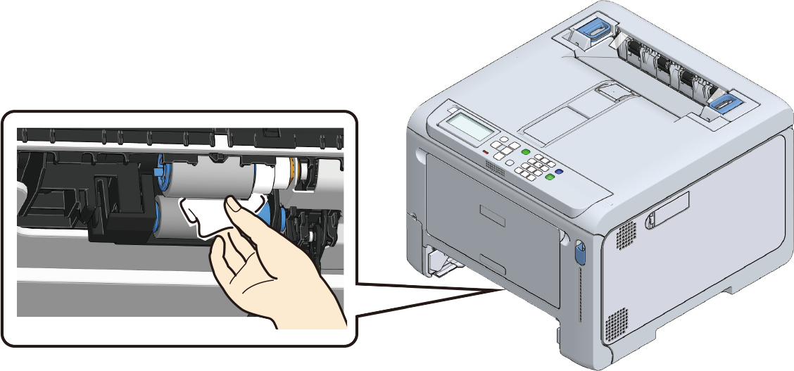 使用蘸水的抹布擦拭本设备内部的两根进纸辊。