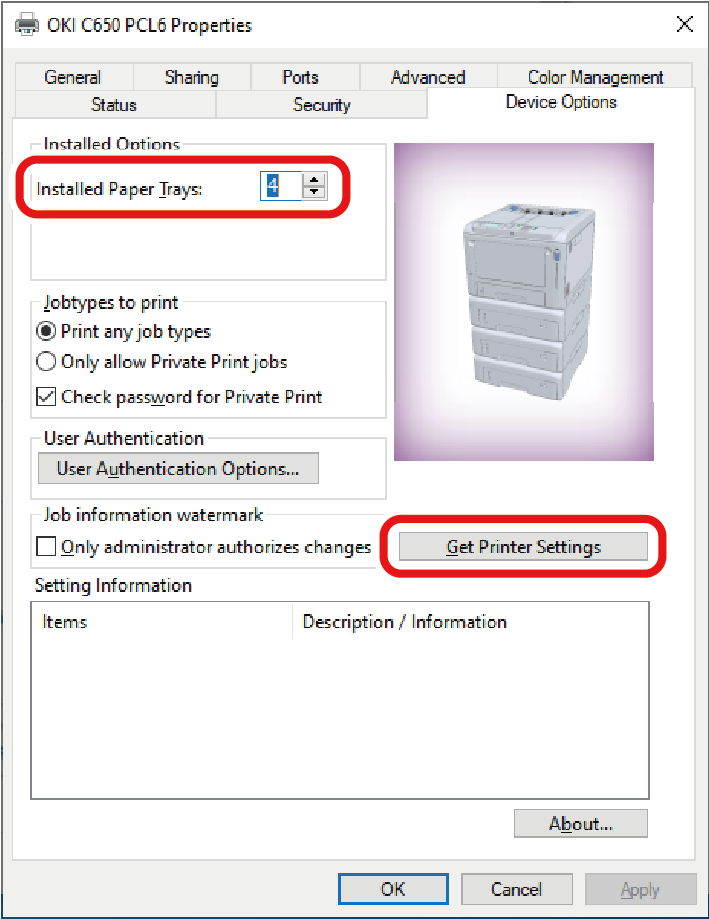 对于网络连接,点击 [Get Printer Settings(获取打印机设置)]。