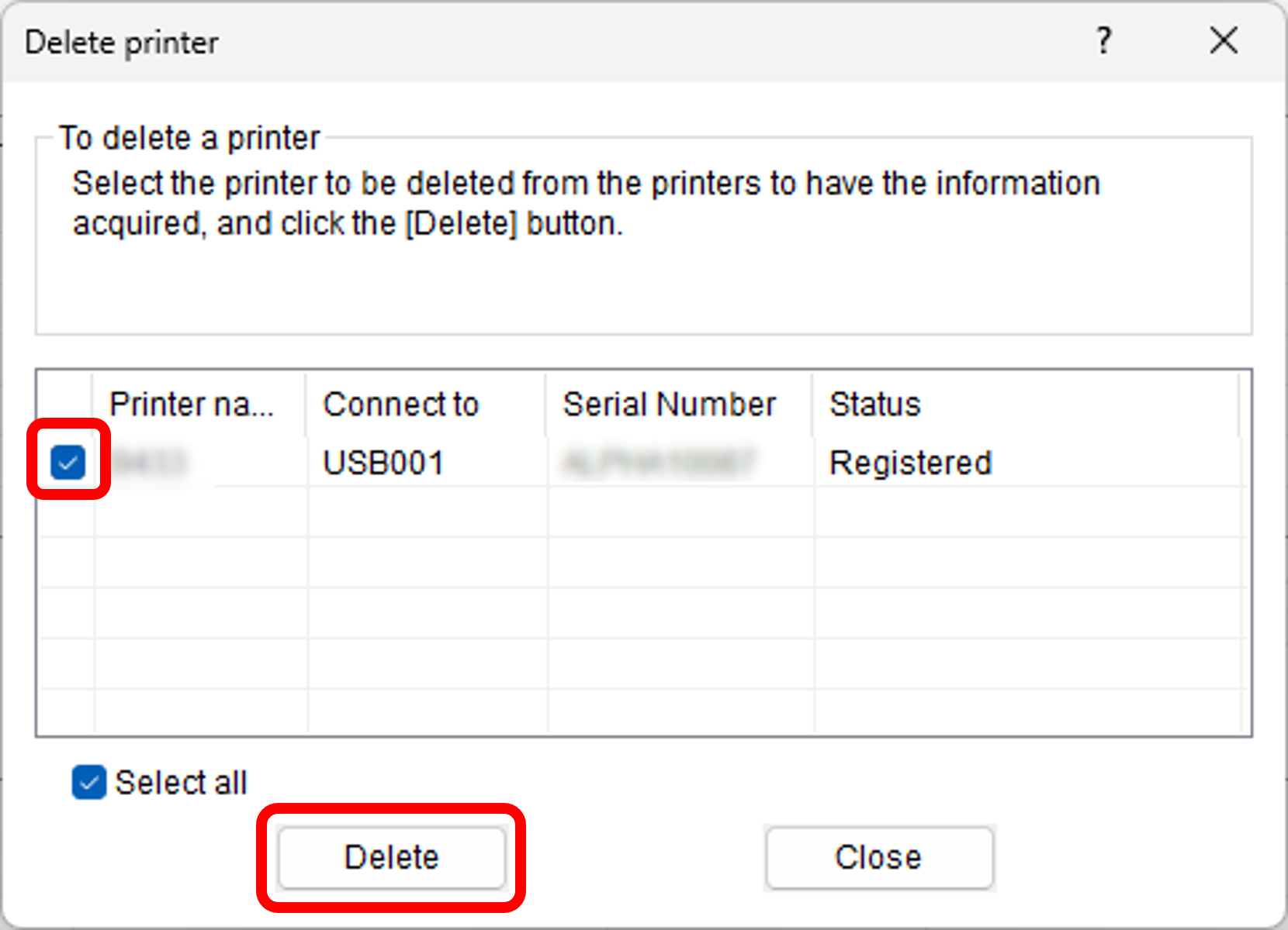 勾选要删除的打印机,然后点击 [Delete(删除)]。