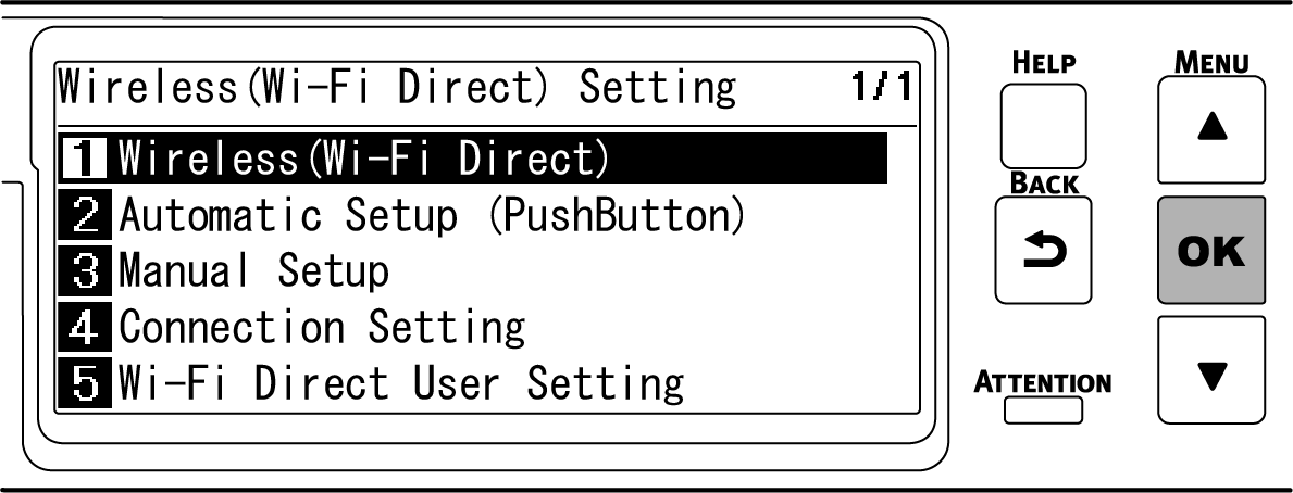 - 反复按操作面板上的滚动按钮 ▼ 选择 [Wireless(Wi-Fi Direct) Setting(无线 (Wi-Fi Direct) 设置)],然后按 «OK»。