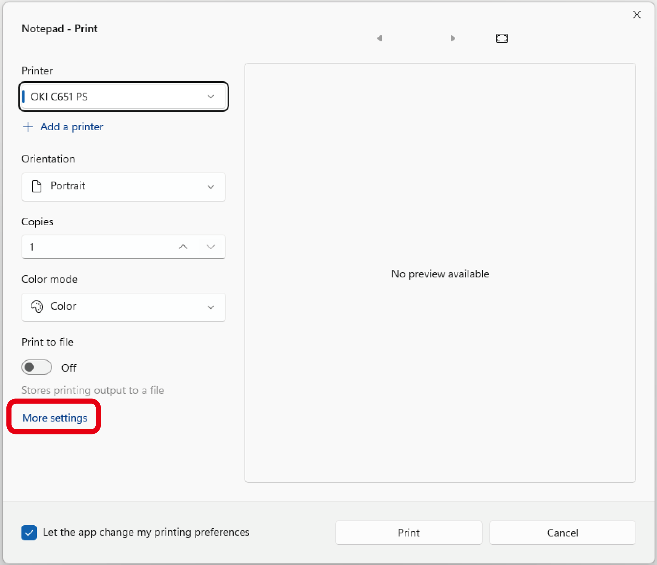 - 从 [Select Printer(选择打印机)] 中选择 [OKI C651 PS(OKI C651 PS)]。