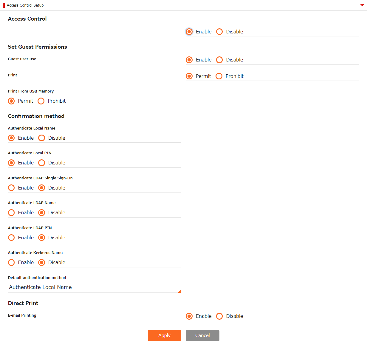 设置为 [Disable(禁用)] 时,可限制未能通过用户验证的用户使用本设备。具体来说,您可以禁止用户验证失败的用户打印和使用操作面板。