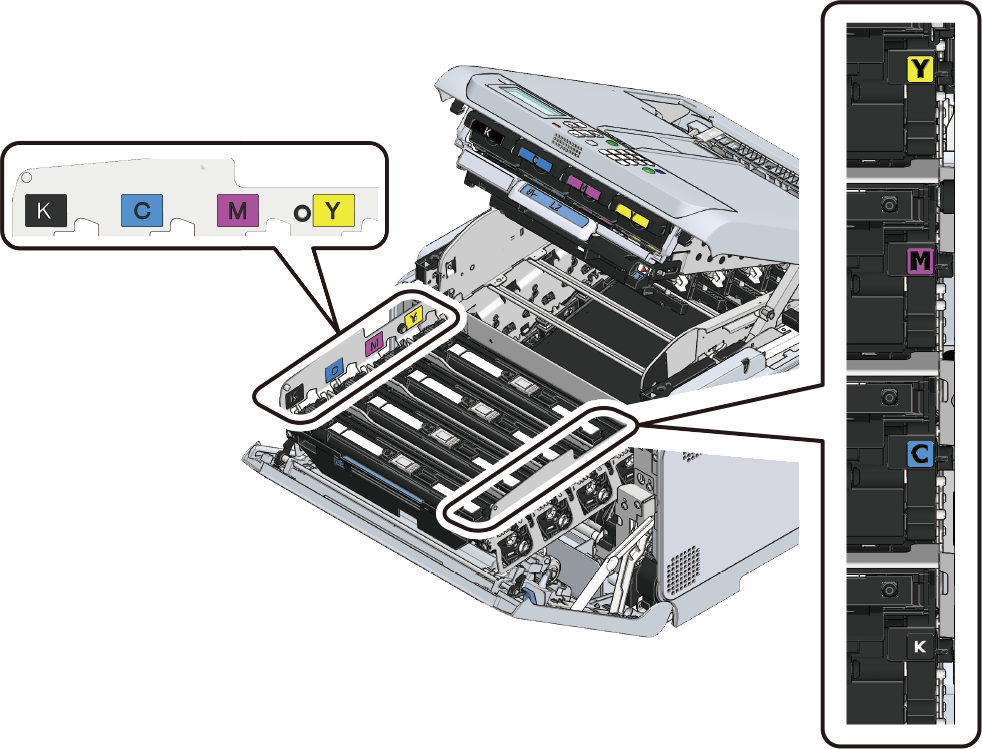 - 必須安裝所有四種顏色的感光鼓才能關閉前蓋。