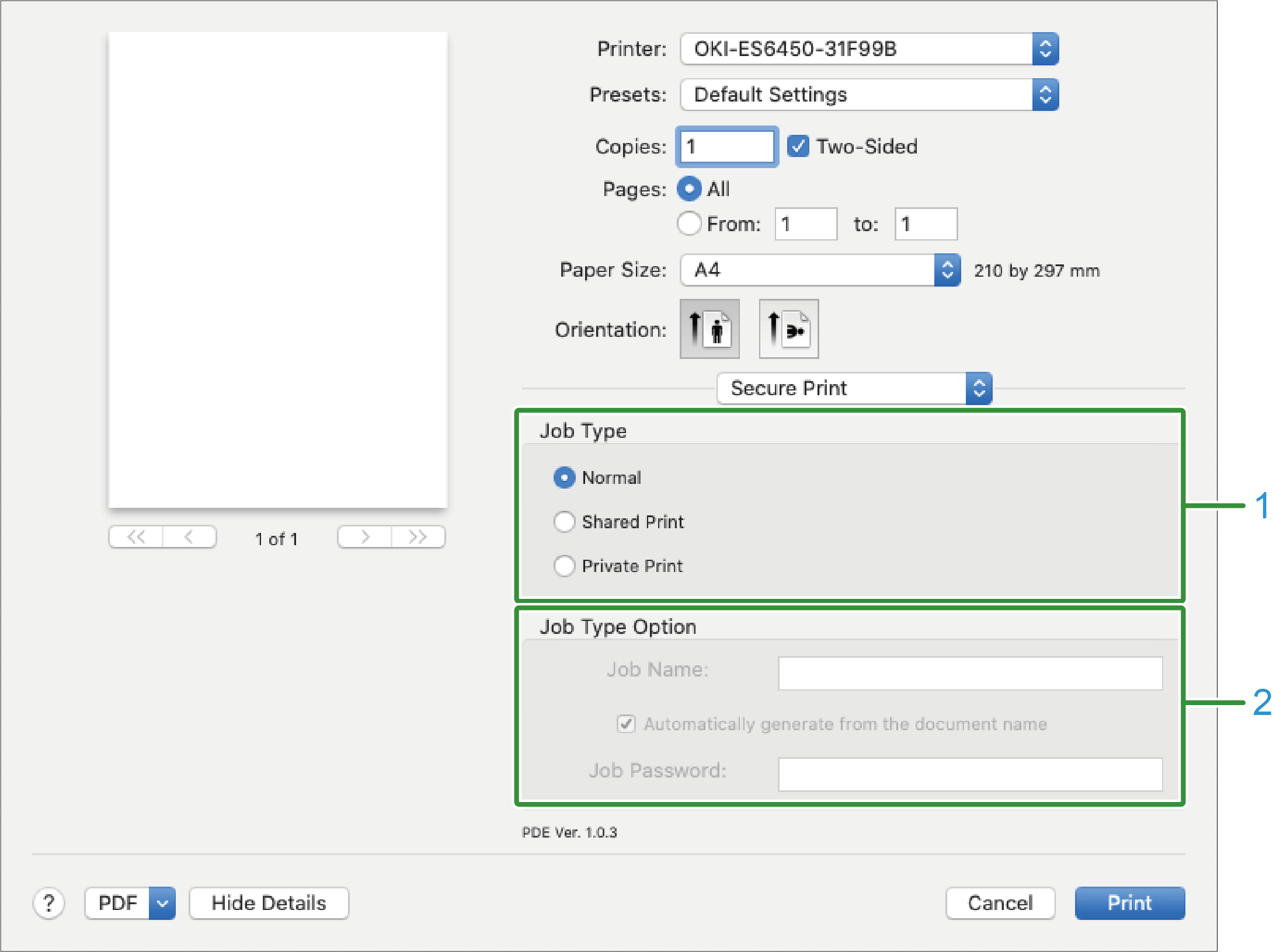 1 | 作業類型(作業類型) | 指定列印資料類型。設定 [Private Print(專用列印)] 或 [Shared Print(共用列印)] 時,會出現 [Job Type Option(作業類型選項)]。 |