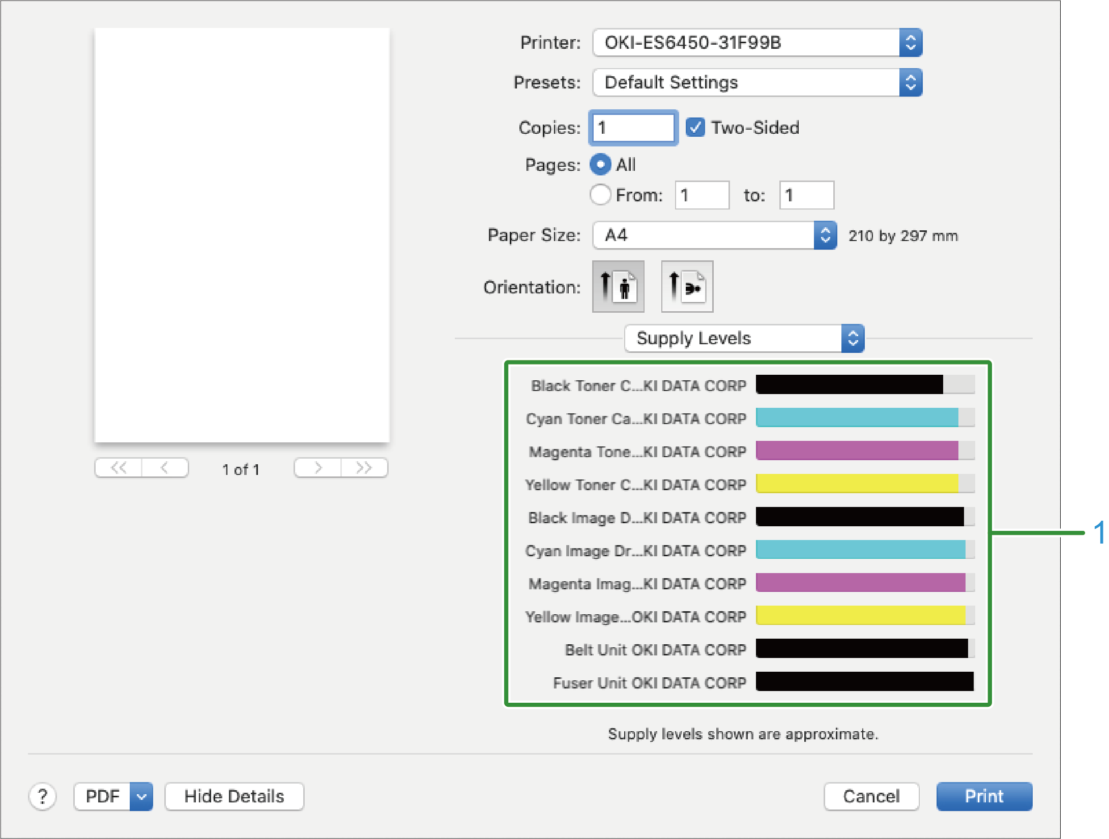 - 端視本機器的連接方式等使用環境而定,[Supply Level(耗材水準)] 面板可能不會出現。