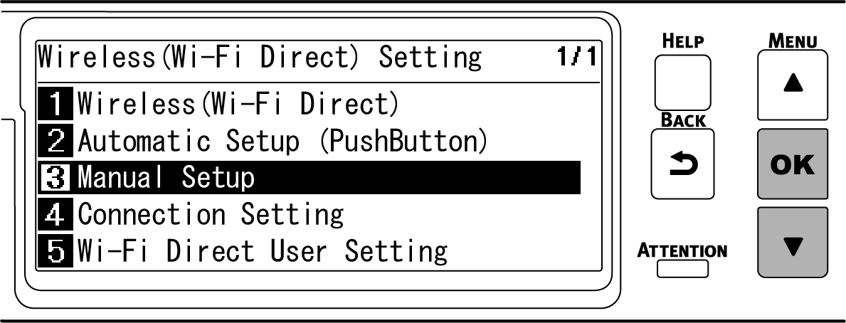 按幾下操作面板上的捲動按鈕 ▼ 選擇 [Wireless(Wi-Fi Direct) Setting (無線 (Wi-Fi Direct) 設定)],然後按下 «OK»。