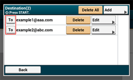 Pressione [Para] para alterar um tipo de destino.