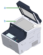 Wipe lightly the document holding pad (a) and document glass (b) with a soft cloth that has been slightly moistened with water and squeezed well.