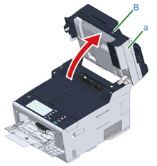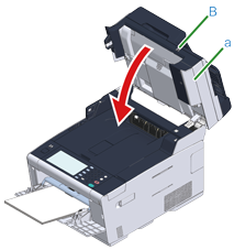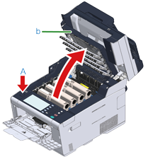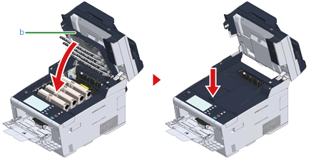 Close the output tray (b) slowly and push the center of the output tray for confirmation.