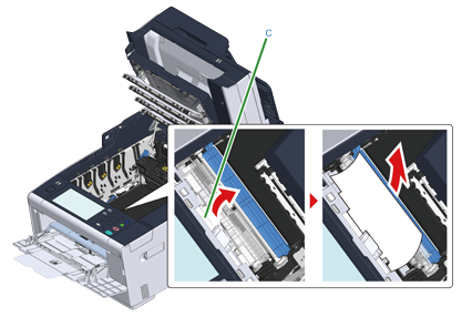 Open the transparent cover (c) inside the machine, remove the jammed paper slowly by pulling the edge of paper.