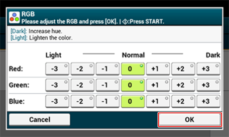 Press [RGB] and press a value for Red, Green, Blue respectively, and then press [OK].