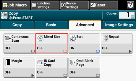 Para utilizar la función de tamaño mixto con la bandeja multiuso, pulse [Device Settings (Configuración de dispositivo)] en el panel táctil y, a continuación, seleccione [Paper Setup (Configuración de papel)] > [Select Tray (Seleccionar bandeja)] > [Copy (Copiar)] para activar [MP Tray (Bandeja multiuso)].