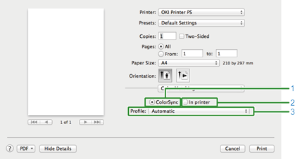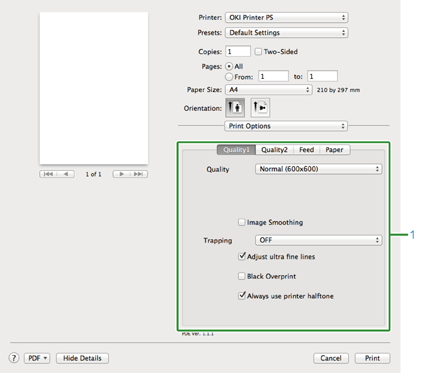 Angiver udskrivningskvaliteten, toner besparelse, papirtype, osv. |