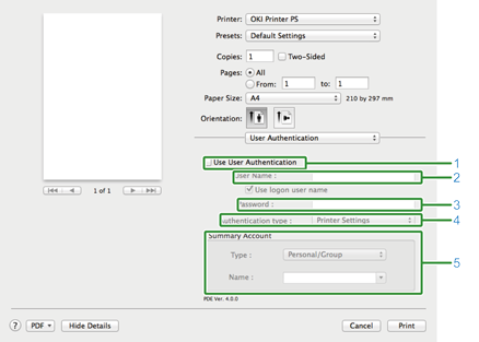 [Authentication type (Godkendelsestype)], [Summary Account (Resumé konto)] kan aktiveres fra apple menuen, vælg [System Preferences (System præferencer)] > [Printers & Scanners (Printere & Scannere)], vælg enheden og aktiver enheden under fanen [Options (Muligheder)] under [Options & Supplies (Muligheder & Forsyninger)].