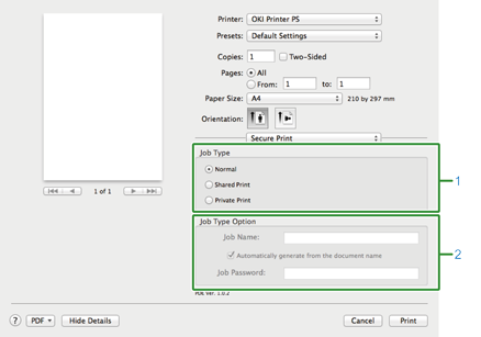 Angiver jobtypen. [Job Type Option (Vælg Jobtype] kan bruges, hvis [Secure as Shared Job (Fastfør som Delt Job)] eller [Private Print (Privat Print)] er valgt. |