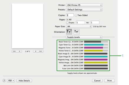 Panelet [Supply Levels (Forsyningsniveauer)] vises måske ikke, afhængig af miljøer såsom hvordan der forbindes til enheden.